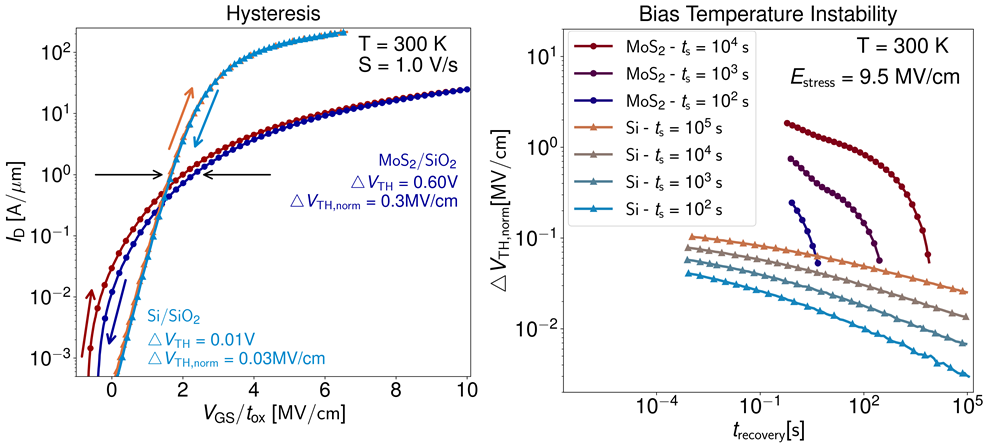 Given the numerous challenges associated with the fabrication of these 2D devices, their theoretical exploration is considered a must. We have transferred and augmented our know-how as we have moved from 3D to 2D material systems and extended our modeling tools accordingly. A key challenge in the field of 2D channel-based transistors is the identification of an optimal gate insulator. A high-quality gate insulator is essential for ensuring optimal capacitive gate control and for minimizing gate leakage currents. Furthermore, in order to mitigate variability, it is essential to create a high-quality interface and to control the threshold voltage well. 2D devices operate reliably if the observed hysteresis and the long-term drifts induced by border traps are small, see Fig. 2. Moreover, the dielectric should withstand elevated electric fields over an extended duration.Two promising groups of insulators for 2D transistors that have been the focus of our studies are native oxides to 2D materials and fluorides. Another focus of our research is on non-idealities, such as point defects in the gate insulator. These defects can lead to reduced mobility, hysteretic behavior, random telegraph noise, large variability, and long-term reliability issues like the bias temperature instability.