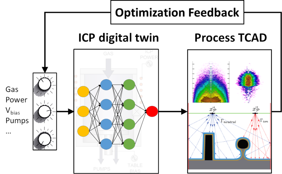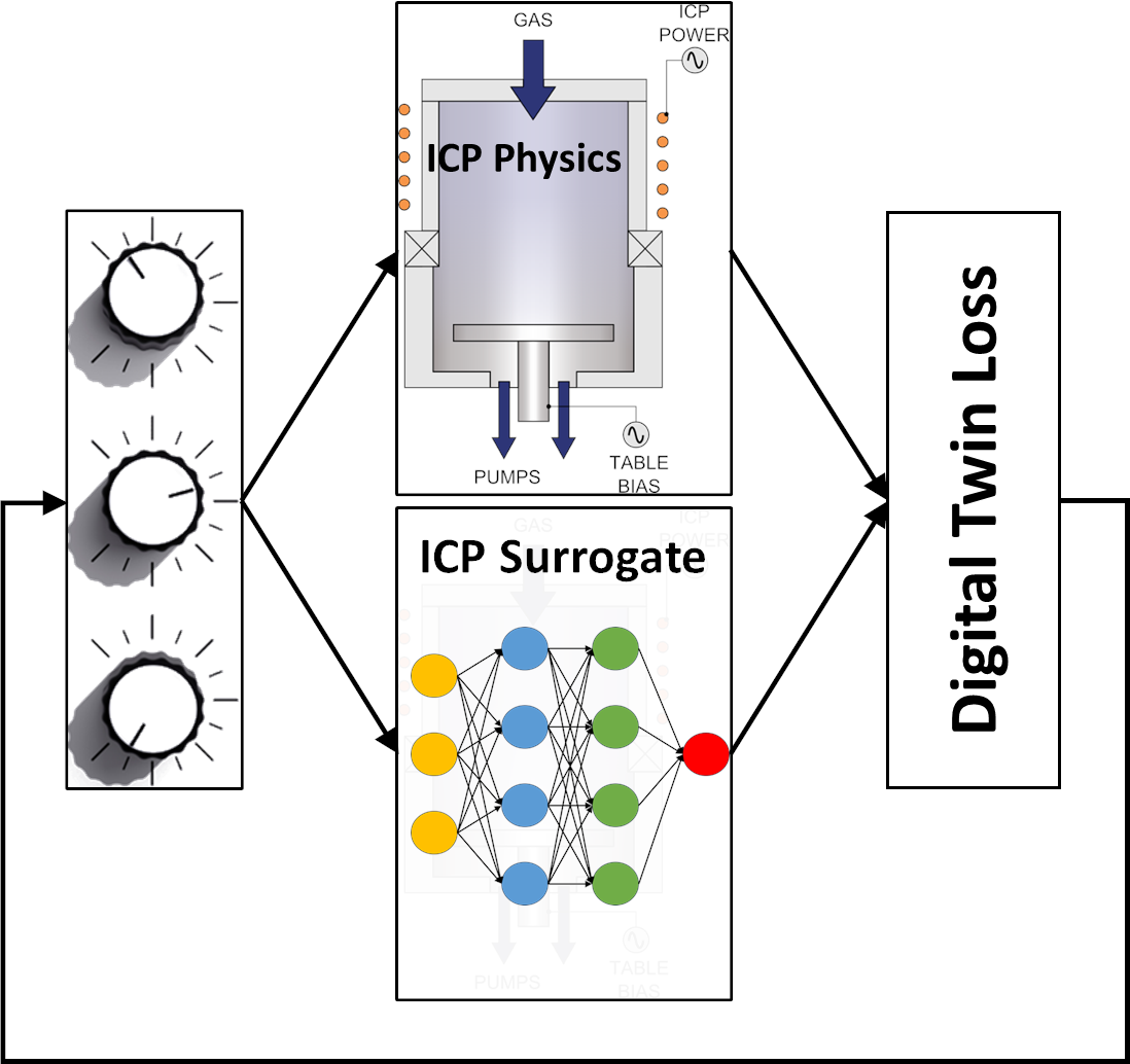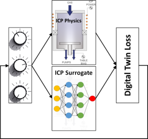 To overcome this limitation, we develop surrogate models, also referred to as digital twins, that emulate the input-output behavior of full reactor simulations. These surrogates are trained on high-fidelity simulation or experimental data and provide fast, differentiable approximations of boundary fluxes (e.g., ion and neutral distributions) as functions of process parameters like coil power, gas composition, chamber pressure, and bias voltage. The training workflow is illustrated in Fig. 3, where a neural network is optimized to reproduce the outputs of a full inductively coupled plasma (ICP) simulation. The surrogate learns the reactor’s response to different control knob settings, minimizing the deviation from the physics-based simulation through a defined loss function.