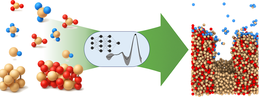 These ML-driven atomistic tools form a foundational part of our multi-scale modeling infrastructure, enabling predictive insights into material behavior that feed directly into higher-level device and process simulations. ML-IAPs are especially valuable in the context of semiconductor reliability, advanced fabrication methods, and new material exploration. This capability allows us to increase the useful time and length scales of molecular dynamics (MD) simulations without any loss in accuracy. For example, we can study atomic-layer silicon etching with fluorine radicals, where direct DFT-based molecular dynamics would be prohibitively expensive. As shown in Fig. 2, small-scale DFT calculations capturing elementary surface reactions are used to train ML potentials, which then drive large-scale molecular dynamics simulations of etching processes with full atomic detail.