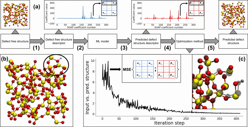 - Defect structure prediction and classification in amorphous and crystalline materials (e.g., a-SiO2, MoS2), using local atomic descriptors and unsupervised learning methods, as illustrated in Fig. 1.