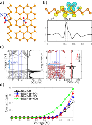 Ab Initio and DFT Simulations: We use first-principles calculations to investigate the electronic structure of doped and pristine 2D materials. These simulations allow us to calculate gas adsorption energies, predict charge transfer between the surface and a gas molecule, and identify the energy levels of dopant- and adsorbate-induced trap states. We have applied these methods to various materials, including blue phosphorene, antimonene, and MoS2.
