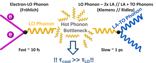 In many materials, carriers rapidly lose excess energy to longitudinal optical (LO) phonons, followed by slower phonon–phonon decay into acoustic modes. This imbalance creates a hot phonon bottleneck (HPB), where reabsorption of LO phonons prolongs carrier lifetimes. This effect, illustrated in Fig. 4, plays a critical role in materials such as lead halide perovskites, where polaron formation and dynamic lattice screening further reduce thermalization rates.