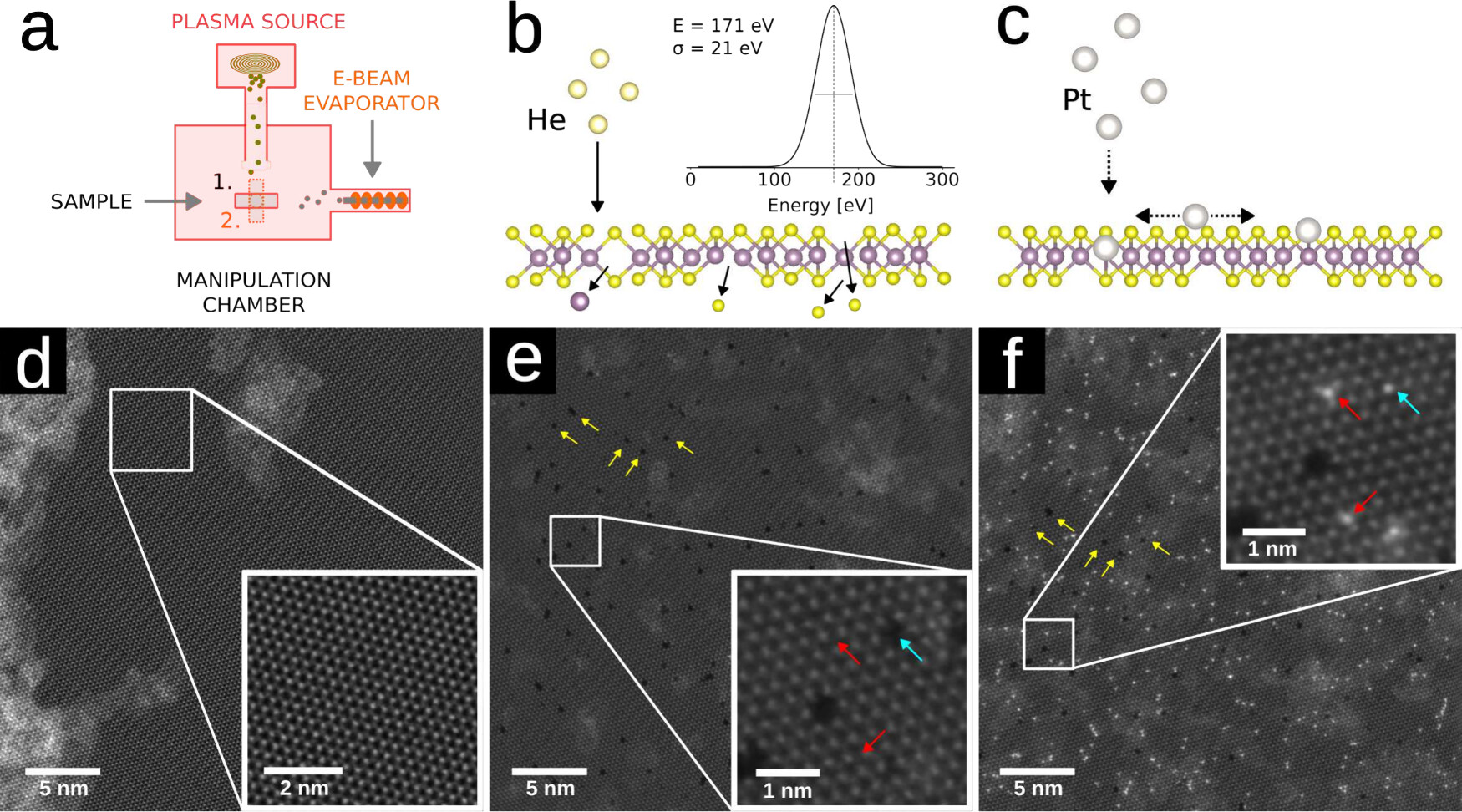 At the core of our research is the ability to precisely modify the properties of 2D materials through substitutional doping. In collaboration with the Physics of Nanostructured Materials group at the University of Vienna, we employ a sophisticated two-step implantation method to introduce specific metal atoms (such as Pt, Au, Pd, Ag, and Ni) into the lattice of materials like MoS2. This technique first uses low-energy ion irradiation (for example, with He+ ions) to create vacancies in the 2D material, followed by metal evaporation in an ultra-high vacuum (UHV) environment to fill these sites. This level of atomic control allows us to engineer the material's surface to have a strong, selective affinity for specific gas molecules like H2, NO2, and NH3. The two-step implantation process is illustrated in Fig. 1.