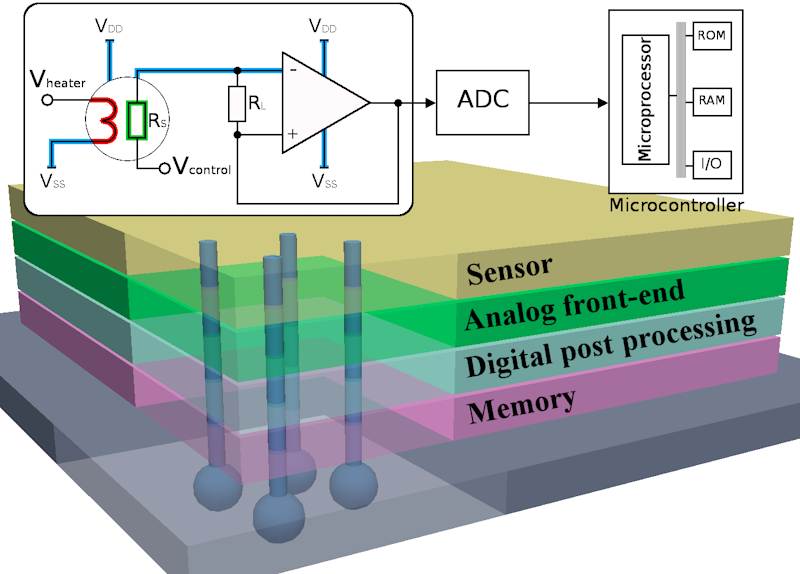 To minimize interconnect length and reduce resistance-capacitance (RC) delay, the ideal integration strategy for gas sensors is direct fabrication within a CMOS process using 3D integration (Fig. 5). This enables compact system-on-chip architectures by embedding the sensor alongside the amplifier, ADC, and microcontroller.
