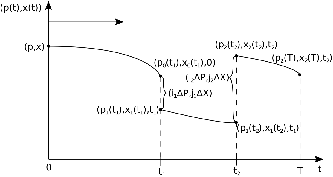 Fig. 1: The trajectory of p(t) and x(t) is projected onto the y-Axis. The particle starts at (p,x,t=0) and moves forward in time in phase space according to the Lorentz force F. When the particle reaches t1 it is scattered, i.e., a factor (ΔP,ΔX) is added. Afterwards, it follows the trajectory again until it reaches t2. This process is repeated until t=T is reached, when the physical quantity AT is evaluated.