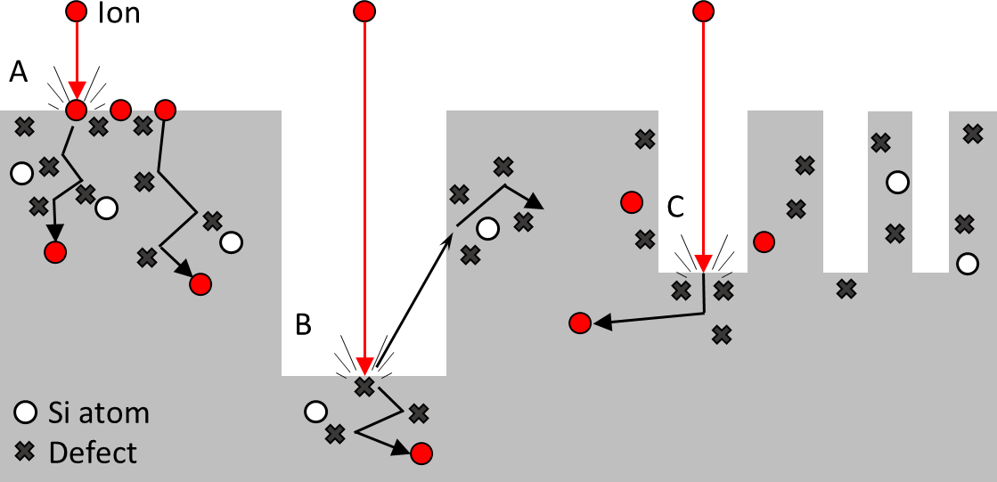 Fig. 1: Visual depiction of the physical plasma-induced damage mechanism in silicon-based devices during plasma processing, showing (A) typical physical damage, (B) sputtering, and (C) lateral straggling.