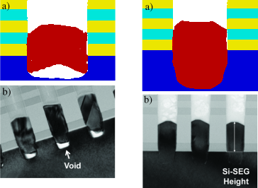 Fig. 2: (a) SEG at the bottom of the etched hole with the damaged layer present, showing the formation of voids. (b) The damaged layer has been removed in a low-energy post-etch treatment, and the SEG covers the entire bottom, leaving no voids. The simulation results are compared to experimental findings (C.-Y. Lung et al., ”Pre-epitaxial plasma etch treatment for the selective epitaxial growth of silicon in high aspect ratio 3D NAND memory”, in: 30th Annual SEMI Advanced Semiconductor Manufacturing Conference (ASMC), 2019).