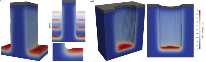 We extend the model to a volume damage representation using a cell set to describe the silicon substrate underneath the surface. The ion damage inside the volume is captured with an adapted binary collision model using a Monte Carlo approach. The path of an ion is determined by launching a particle from the source plane above the surface and tracing its trajectory to find its direction and position upon impact with the surface. The ions are then assumed to travel through the material, experiencing a number of independent collisions with the silicon atoms. The energy transferred to the nuclei will cause damage to the silicon substrate, based on the Kinchin-Pease theory. Fig. 3 shows the results of the model, when applied to two different geometries: (1) a 7 nm-wide fin and (2) a vertical channel hole with a diameter of 40 nm. Due to the highly directional trajectories of the ions, the resulting damage is predominately confined to the bottom regions of the structures. However, we also observe some residual damage on the sidewalls, which is most likely caused either by reflected ions or by lateral straggling effects which is a consequence of ion scattering inside the substrate.