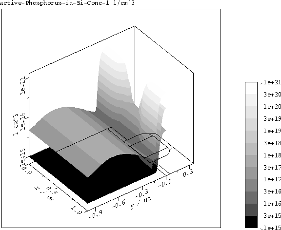 Fig. 8.18 shows the boron, phosphorus and arsenic doping concentrations of the NMOS device as a result of the CMOS process run with the SFC. The doping profiles of the silicon segment are shown, since these are the ones of interest for a device simulator. Each of the doping profiles is defined on a triangular grid, each consisting of about 500 triangles. The final ASCII PIF file including all process steps is about 8.2 MB in size, whereas the binary PIF file is 1.8 MB in size.