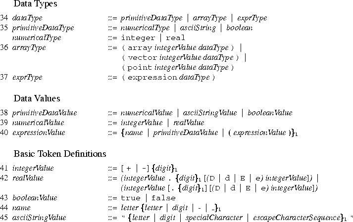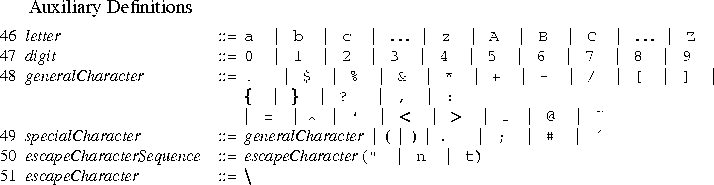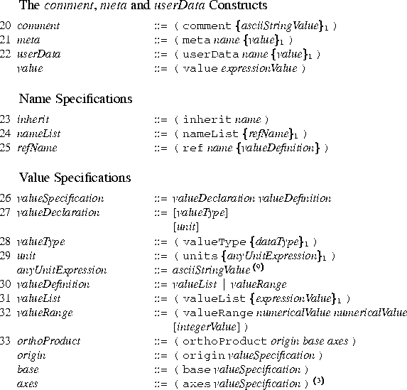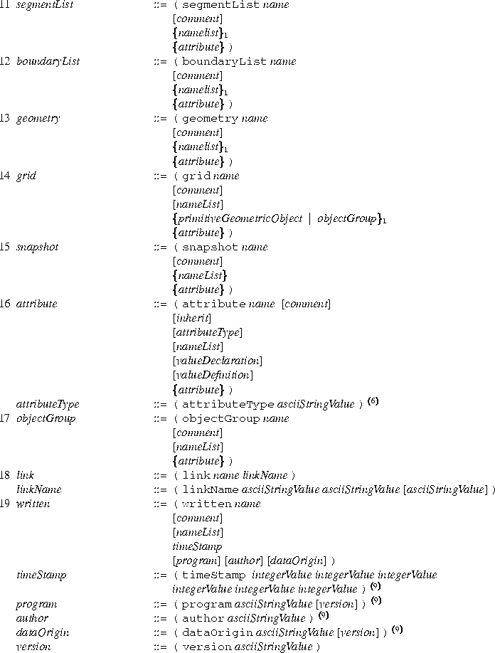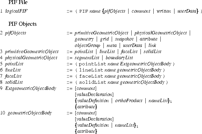 In this section the PIF syntax is described in BNF notation. The sequence number to the left of every syntactic construct is referred to in A.4, where the syntax and some semantics are explained in detail.