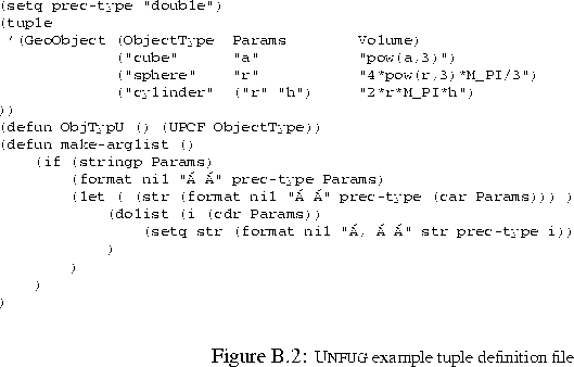 Consider the tuple file definition of Fig. B.2. This file defines a tuple named GeoObject which has three variables associated with it, namely ObjectType, Params, and Volume. The tuple holds three value lists with string values for each variable symbol. The last line defines a LISP function ObjTypU returning the ObjectType string with the first letter uppercased. The argument list of the respective functions is generated through the make-arglist function, which uses a dedicated variable prec-type defining the precision type to be used for the generated functions. This variable is set on the beginning of the tuple file. By redefining this variable and running UNFUG again, a double precision (double type) or single precision (float type) version can be generated with minimum effort. This flexibility is another intrinsic advantage of the UNFUG code generation concept.