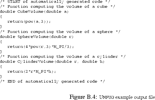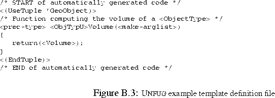 Now consider the template file of Fig. B.3 to be used with this tuple. This template defines a C function for computing the volume of the respective object. Running UNFUG on this template with the previous tuple file produces the output shown in Fig. B.4.