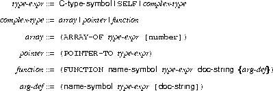 Type expressions are used throughout VOOPS to define data types of class members, method return values or method arguments. The type expression can be any known C type specified as a LISP symbol, the symbol SELF meaning a generic VOOPS object pointer, or any nested combination of complex data types. A description of the type expression syntax is given in BNF (Backus-Naur Form) in Fig. C.2.