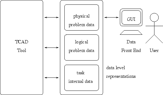 All the data items seen by a TCAD tool have to be represented consistently on the data level, because an application wants to ``know'' the semantics of what it reads. It simply does not suffice for the application to ``read a real-valued array'', the application wants to ``read the net doping concentration defined on the channel segment'' from the data level. Therefore the data level has to present high-level views of all those ``objects'' to the application. Especially three of those high-level views are of concern: the geometry representation, the grid representation and the quantity representation.