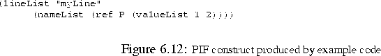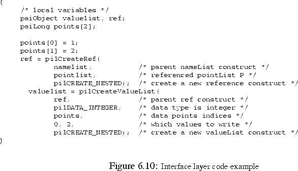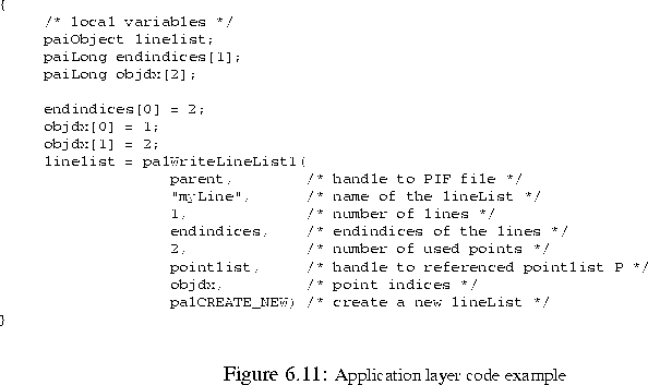 The short code example in Fig. 6.10 shows the C calls to generate an example of a PIF data structure. nameList is the handle to the parent nameList object [IuE94]. The points array holds the indices of the points on which the line is created. In the Application Layer code example Fig. 6.11 this part of information is generated by the function palWriteLineList1. In addition to the reference construct this function generates the whole lineList construct, as can be seen in Fig. 6.12.