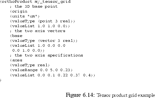 The special orthoProduct construct was introduced to support tensor product grids in PIF, which significantly enhances the efficiency of storing tensor product grids while preserving its advantageous structure. The PIF orthoProduct grid has an origin point, may have different topological and topographical dimensions and each dimension may have a different base vector. Conforming to the PIF syntax, the number of supported dimensions is in principle infinite. The example Fig. 6.14 shows a tensor product grid of topological dimension two lying in three-dimensional space. This capability is needed e.g. to describe distributed boundary conditions of a three-dimensional device.