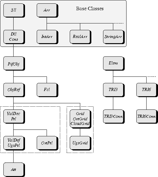 The various class definitions result in a class tree which is shown in Fig. 7.2. The solid lines denote an inheritance branch, whereas the dashed lines denote a continuation by further similar classes on demand. While the array and element classes seem to be unrelated to the other classes in this diagram since they define their own inheritance trees, they are actually used in many places throughout GRS for point list and attribute representations on the one hand, and unstructured grid element representation on the other hand.