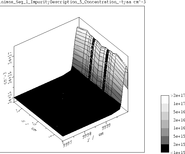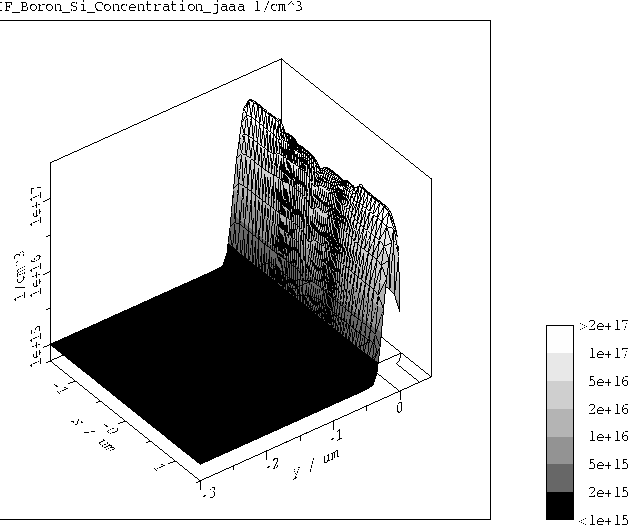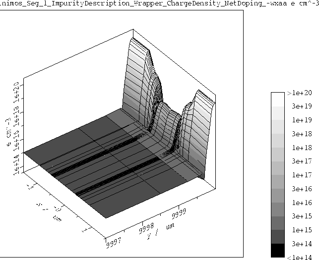 Fig. 7.13 shows the original boron doping on the triangular grid as converted from the TIF file. After interpolation and gradually refining the grid, the MINIMOS wrapper generates a boron doping on a tensor product grid as shown in Fig. 7.14. Note that the grid lines are dense in areas where it seems unnecessary, which can be accounted to the fact that the net doping is used as a grid refinement criterion, and all output attributes of the wrapper are defined on the same tensor product grid. The final net doping is shown in Fig. 7.15 where the grid lines are dense where the doping values change rapidly.