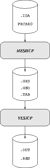 Fig. 8.1 shows the data flow of the VLSICAP standalone version. A geometry description file (extension .IDA) is fed into the grid generator MESHCP together with an input deck PRCARD. The grid generator produces a transfer file (extension .TAB) for the capacitance calculator VLSICP containing the geometry and the grid. Additionally, the (possibly quantitatively modified, since multiply connected domains are simplified to single connected ones) geometry is written by MESHCP into a .GEO file, and the grid onto a .GRD file for intermediate visualization.