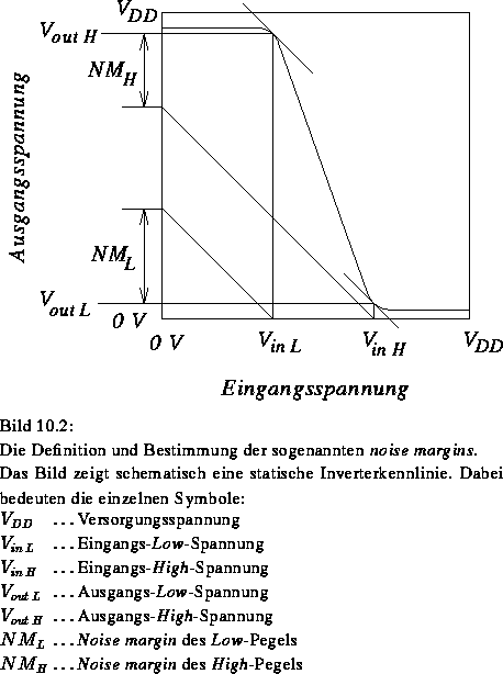 Eines der wichtigsten Kriterien zur Beurteilung einer Technologie sind die Rauschabstände (noise margins) der beiden Pegel (Bild 10.2).