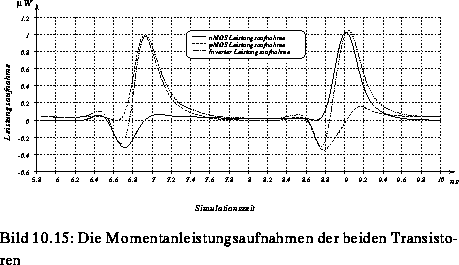 Bild 10.15 zeigt die Leistungsaufnahme der Transistoren als Summe der Produkte aus Anschlußströmen und Anschlußpotentialen. Aus diesen Leistungen läßt sich die tatsächliche Schaltenergie bestimmen, die eine Inverterstufe beim Umschalten verbraucht.