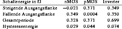 Die folgende Tabelle gibt die Schaltenergien in der Inverterstufe an, aufgeschlüsselt nach den beiden Schaltrichtungen und nach den beiden Transistoren der Stufen. Die Grenze zwischen den beiden Schaltvorgängen wurde willkürlich bei 7.9 ns gezogen. Die Daten der Tabelle verstehen sich als Gesamtenergieverbrauch, der eigentlich noch in die tatsächlichen Schaltenergien und einen Grundanteil von statischer Verlustleistung aufzuschlüsseln wären. Da die Periodendauer des Signals im Vergleich zur Schaltzeit relativ kurz ist, kann man die statische Verlustleistung vernachlässigen.