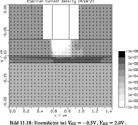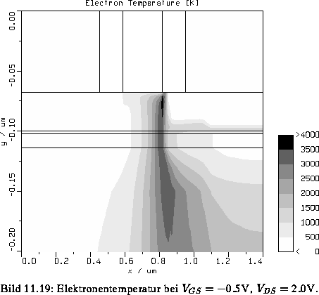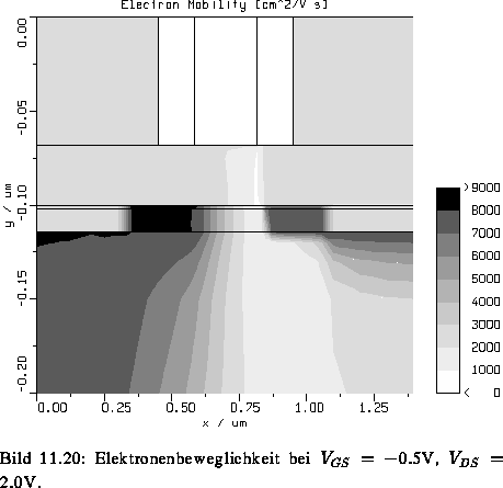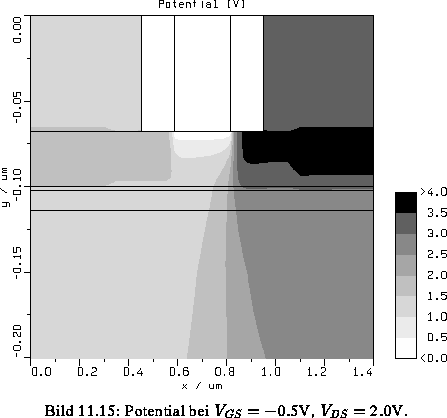 Das dargestellte Gebiet in diesen Bildern und in allen folgenden Betriebsbereichen stellt einen repräsentativen Ausschnitt aus der simulierten Geometrie dar, in dem die Verhältnisse in Kanal, spacer layer und supply layer gut erkennbar sind. Die Vorgänge im Substrat wurden für den Subthreshold-Fall bereits eingehend erläutert.
