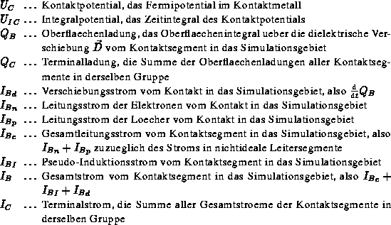 Diese Größen sind für jeden Kontakt als Variablen im Gleichungssystem enthalten. Die Gleichungen für die Oberflächenladung (7.54) und den Elektronen- und Löcherstrom (7.56) wurden bereits über die Kontrollfunktionen definiert. Die Aufintegration des Leitungsstroms in nichtidealen Leitern (Ohmschen Leitern) und des Pseudo-Induktionsstroms erfolgt auf dieselbe Art in den entsprechenden Größen.