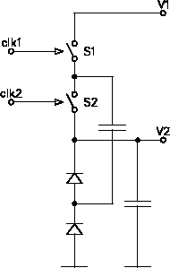 One well-known converter principle is the switched-capacitor (SC) converter. The low-voltage is shown in Fig. 2.14. It can be regarded as a voltage divider or doubler (operating in reverse direction). The clocking signals clk1 and clk2 can be generated as shown in Fig. 2.15. When a clock signal is applied to the input A the rising edge of X1 occurs T after that of X2, and the falling edge of X2 occurs T after that of X1, eliminating the crowbar current through the transistors. clk3 and clk4 are level shifted versions of clk1 and clk2 respectively. The advantages of this SC converter circuit are that it needs only capacitors for energy storage and each transistor ``sees'' at most the output voltage across its terminals. The main drawback is that the current flows across two switches instead of one and the requirement of a fairly large floating capacitor.