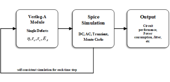 To describe the device physics at the circuit level in a manner that is compatible with state-of-the-art circuit simulators, a Verilog-A module has to be implemented. This module will describe the charge transfer reactions of single defects using non-radiative multi-phonon theory, enabling one to describe RTN and BTI. For this, the model has to be calibrated against experimental data to determine the distribution of trap levels and energy barriers. The applied biases are provided by the SPICE simulator. Finally, parameters, like circuit performance, power consumption and jitter, can be studied in detail for arbitrary input signals, considering single defects for the first time at this level.