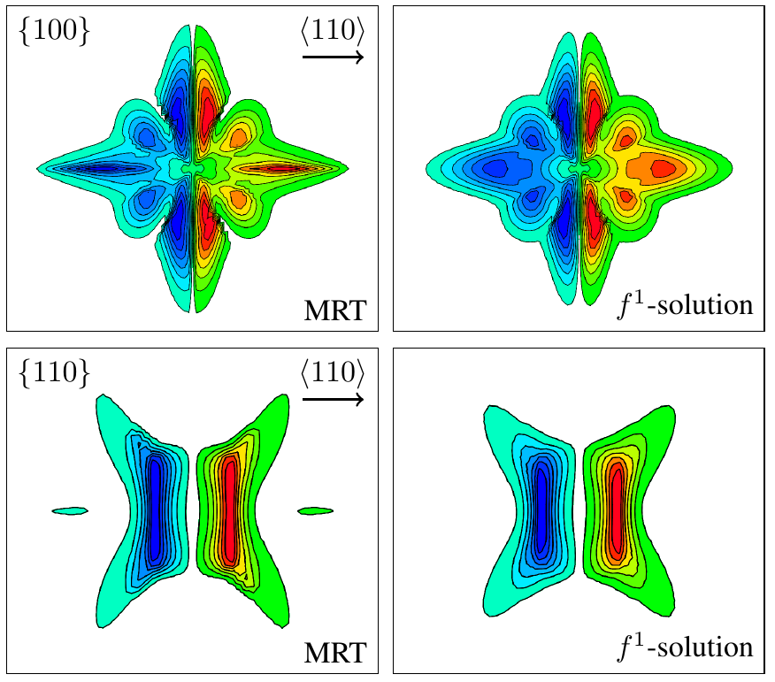 Fig. 1: Response of the hole distribution function for {100} and {110}-oriented p-type MOS channels. The left pictures show the response in the Microscopic Relaxation Time (MRT) approximation, the right pictures show the result from the linearized Boltzmann equation. The coupling among subbands causes a redistribution of carriers not seen in the MRT picture.