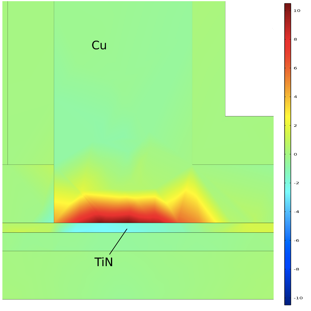 Fig. 2: Stress in the cross section view of the TSV bottom (MPa). The Cu/TiN interface is recognized to be the site of void nucleation in the structure.