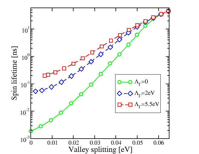 Fig. 1: Spin lifetime as a function of the valley splitting at room temperature in a 2.7nm thin silicon film.
