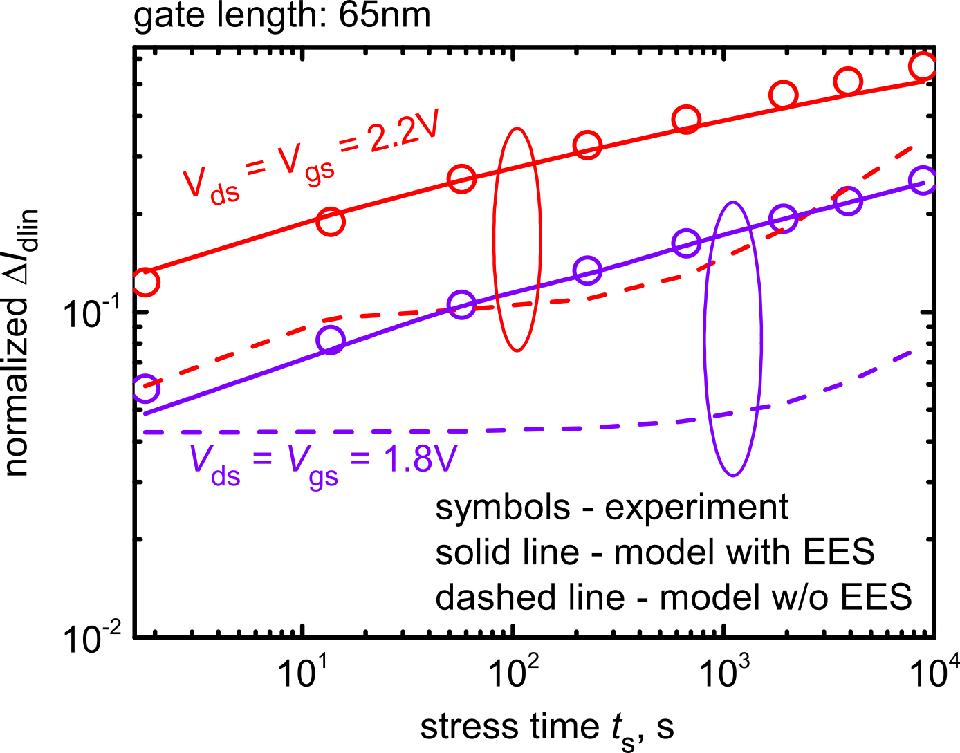 Fig. 1: The normalized change of the linear drain current simulated with and without EES for an nMOSFET with a gate length of 65nm for the HCD worst-case conditions and two different values for the drain voltage: 1.8V and 2.2V. One can see that the effect of EES is substantial for both stress voltages. As a reference, the experimental degradation traces are also shown.