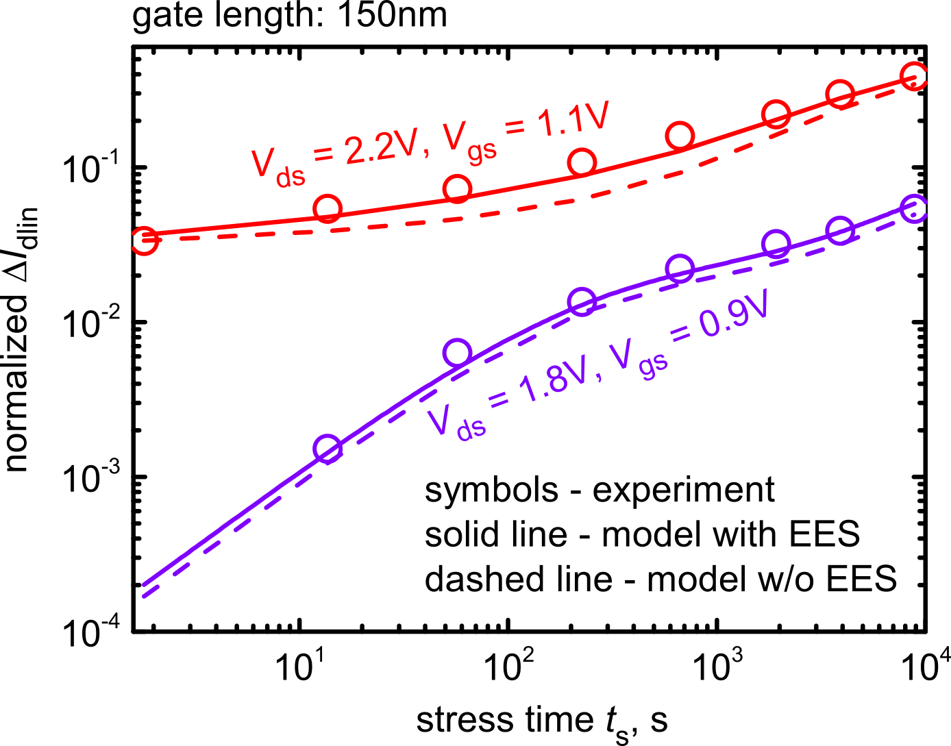 Figs. 1 and Fig. 2 show the experimental change of the linear drain current measured in the devices with gate lengths of 65nm and 150nm stressed at the worst-case HCD conditions and two different drain voltages of 1.8V and 2.2V. To analyse the effect of EES on HCD, we have also plotted degradation traces obtained without EES. One can see that in the case of the 65nm device, ignoring EES leads to a substantial underestimation of HCD also at a relatively low drain voltage of 1.8V. As for the 150nm counterpart, the effect of EES is negligibly weak even at a higher drain voltage of 2.2V. In previous paradigms of hot-carrier degradation, only the channel/gate length was used to judge the importance of EES for HCD. Our findings suggest, however, that a superposition of the device geometry and applied voltages determine whether the effect of electron-electron scattering is strong or not. To check this idea, additional simulations were also performed for the 300nm transistor stressed at the worst-case conditions but at a drain voltage of 2.8V. One can see that if EES is neglected, HCD is overestimated by more than 20%. We conclude thus that the importance of EES is determined by the device topology and the applied stress/operating voltages, i.e., not exclusively by the gate/channel length.