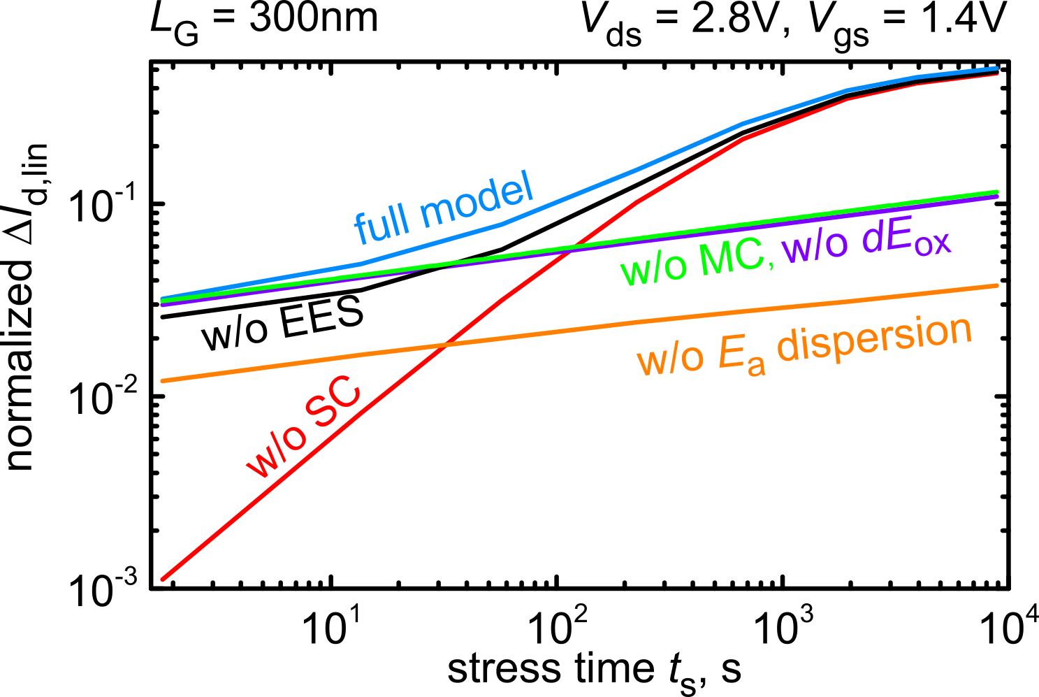Fig. 3: The linear drain current change vs stress time simulated for the 300nm nMOSFET with the full model and ignoring one of the model components (the two competing mechanisms of the bond rupture, EES, dispersion of the bond-breakage energy, and its reduction by field-dipole interactions). The stress drain voltage is 2.8V. One can see that the effect of EES is strong.