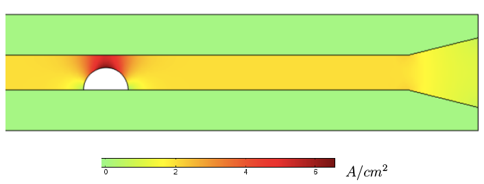 Fig. 1: Current density distribution around a void in a mechanically confined interconnect.