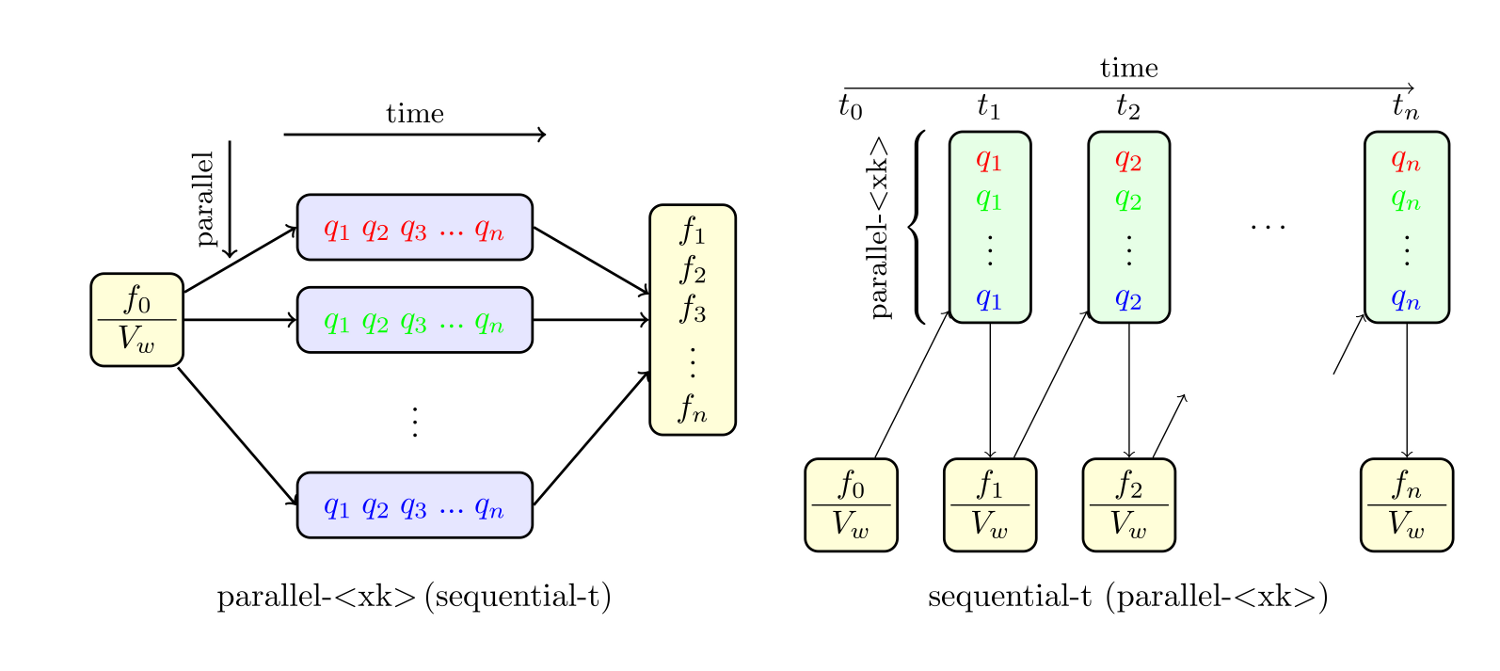 The first method uses the fact that the wave packets are independent. Each wave package is independently simulated from start-time to end-time and each simulation is distributed over multiple computing nodes. This method is characterized by extreme scalability, as no communication between the compute nodes is needed during simulation. Furthermore, the memory demands can be divided amongst the nodes. At the end, all partial results are combined to yield the final distribution. This method is feasible, however, only when there is no scattering during propagation, and the Wigner potential does not depend on the time evolution of other nodes.