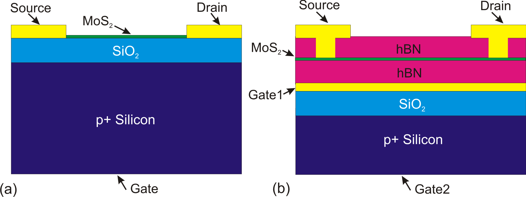 Fig. 1: Schematic configurations of our MoS2/SiO2 (a) and MoS2/hBN (b) transistors. The insulator thickness of both SiO2 and hBN is around 90 nm. The device with hBN has two gate contacts, one through the highly doped Si substrate and the other through a Ti/Au pad, which is situated between the SiO2 and hBN layers. The drain and source contacts are made of Ti/Au.