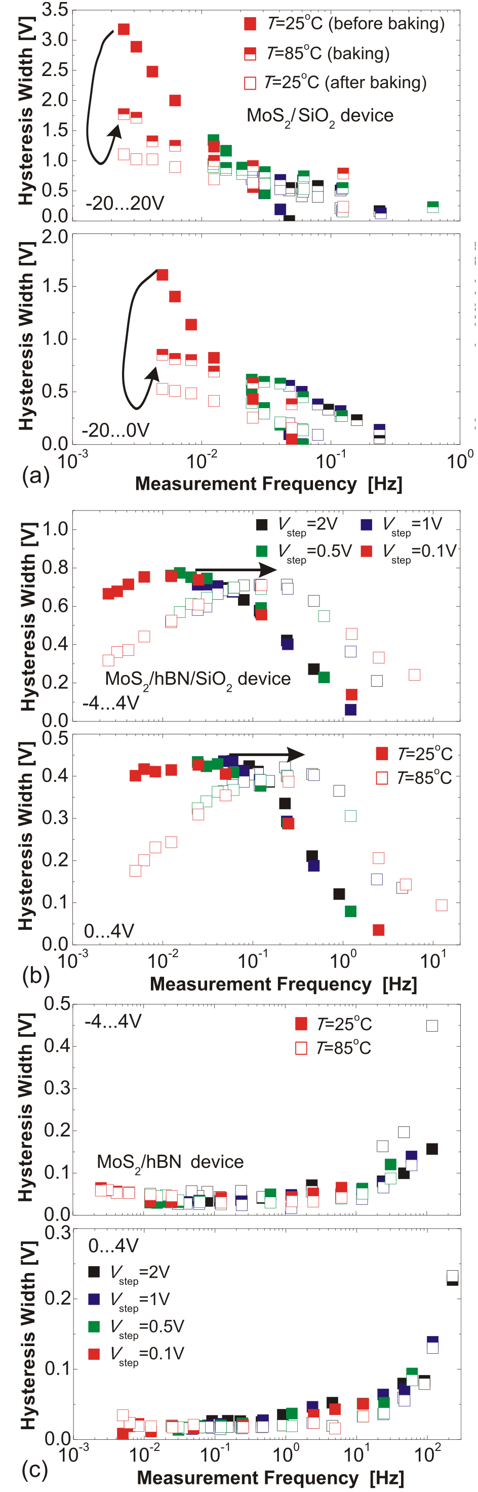 Most of the previous studies, however, have been restricted to statements confirming the existence of a hysteresis in the gate transfer characteristics for different measurement conditions. We have performed a systematic study of the hysteresis in our MoS2 FETs with SiO2 and hBN insulators (Fig. 1) by measuring the gate transfer characteristics using different gate bias sweep rates and sweep ranges. We found that the hysteresis widths extracted around the threshold voltage form a universal dependence versus the measurement frequency.