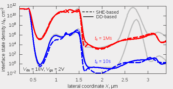 Fig. 1: Interface state density profiles obtained with SHE- and DD-based models for the nLDMOS transistor, without the effect of the MC-process at stress times 10 s and 1 ms. The case where all the superpositions of SC- and MC-processes are considered in the DD-based model is also plotted for comparison (grey lines).