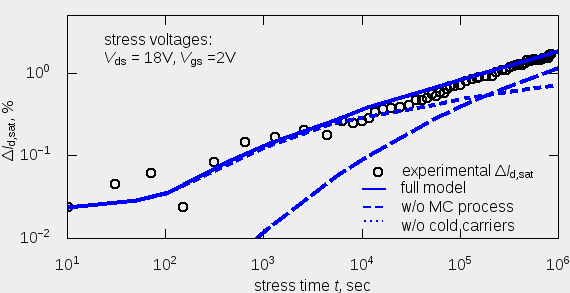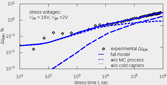Fig. 2: The change of the linear drain current as a function of stress time: Experimental data, the results of the full model, and the traces obtained neglecting the cold carrier term in DF and without the MC process.