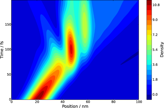 Fig. 1: Propagation of a wave packet through two barriers located at a position of 50 nm and 55 nm