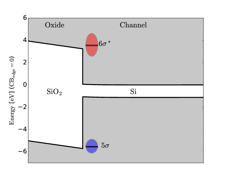 Quite interestingly, however, both ionic doublet states show a bonding character with equilibrium positions shifted in respect to the ground state PES. For the negatively and positively charged state, we considered the case where the 6σ* orbital was occupied by an electron and the 5σ orbital was occupied by a hole. Stokbro et al. calculated the energy level of these two orbitals for a Si slab passivated with H. Their results are summarized in Fig. 2 in the context of an Si-SiO2 interface of a MOS device.