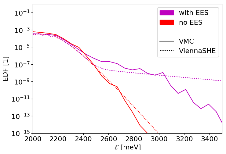 In order to investigate whether this behavior is physical, we implemented an e-e scattering model in the full-band simulator VMC, with as few approximations as possible. Our results clearly showed an enhancement of the high-energy tail of the distribution, which however is not as pronounced as predicted by a deterministic Boltzmann solver, which relies on additional approximations (Fig. 1). In order to gain a better understanding of the e-e scattering process and the approximations used and in order to allow for additional comparisons, we also implemented this scattering mechanism for the analytical band structure model in VMC.