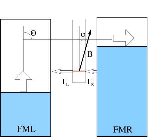 Fig. 1: The quantum well is positioned between the two ferromagnetic non-collinear electrodes. ΓL and ΓR are the tunneling rates and B is the magnetic field.