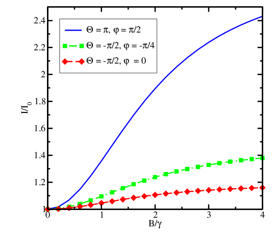 Fig. 2: The dependence of the magnetoresistance on the magnetic field for several angular arrangements. The anti-parallel contact arrangement results in a stronger dependence on the magnetic field orthogonal to the magnetizations.