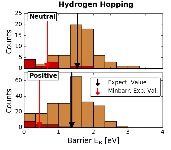 In order to determine the migration barriers, first configurations as in Fig.1 were created using DFT calculations. Then, the minimum energy path interlinking such configurations was calculated using nudged elastic band calculations. The migration barriers shown in brown in Fig. 2 are the migration barriers from a handful of starting points to their ten nearest neighbors. By far the most likely transition is always determined by the lowest barrier in each set, however, as presented in red in Fig 2. The hopping transition barriers for H+ and H0 turn out to be, on average, at a comparable height. This means that hopping in both charge states seems possible.