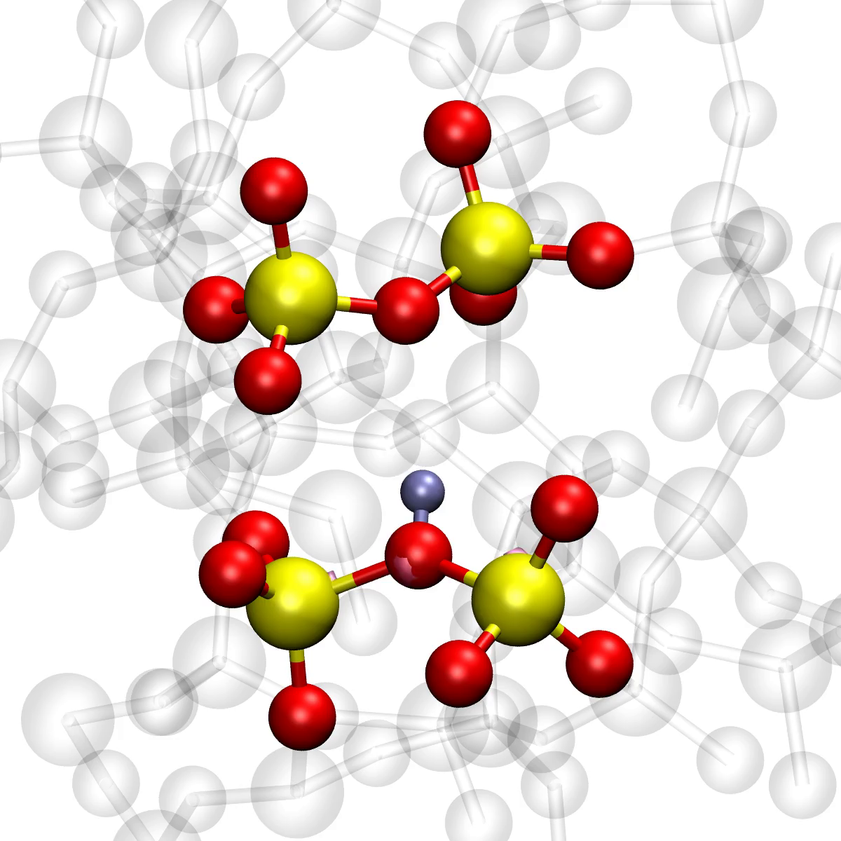 Fig. 1: Example of H migration in SiO2. The H breaks off at one bridging O atom and rebinds to a neighboring one.