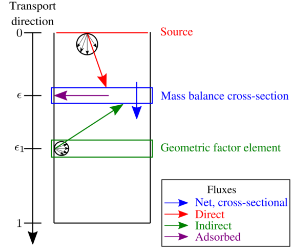 Fig. 2: Schematic representation of the resulting system of ordinary differential equations modeling neutral transport. The colors relate to Fig.1. We note the differences between our model and the standard Knudsen diffusion approach: The presence of direct flux and the geometric factor. The adsorbed flux is modeled by a volumetric sink term.
